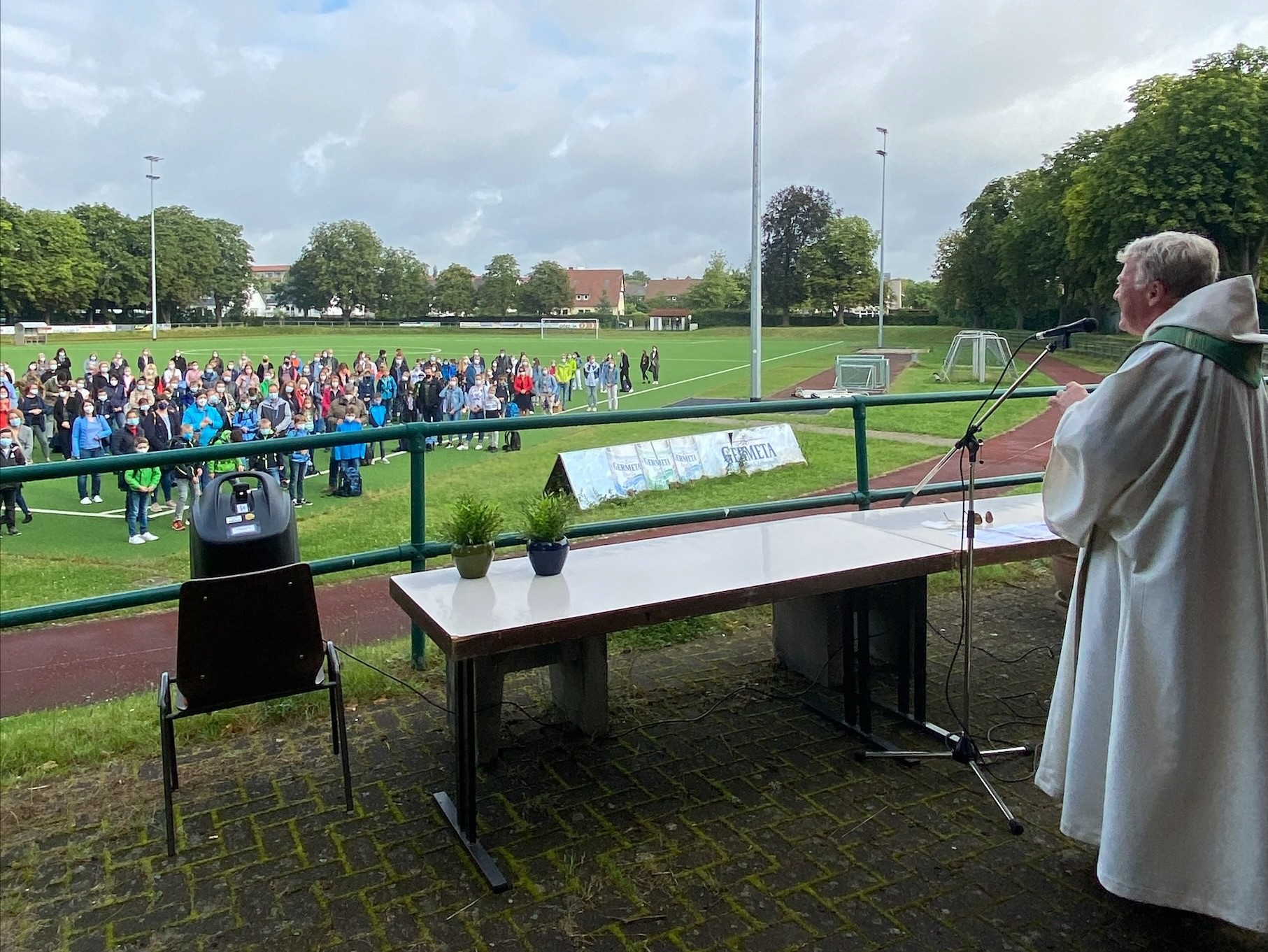 Pandemiebedingt verlief auch die Einschulung anders als gewohnt. Der Einschulungsgottesdienst fand auf dem Hüffertsportplatz statt und auch die Masken- und Abstandspflicht bestand während der gesamten Feierlichkeiten. Pastor Johannes Insel betonte, die Feier sei ebenso besonders, wie die Kinder. Unter diesem Motto stand auch die Messe „Besonderheit, Talente und Wertschätzung“. Jeder ist einmalig. Die Aufgabe der Schule ist es, diese Einmaligkeit zu fördern, insbesondere in Zeiten von wachsendem Leistungsdruck Eine wertschätzende Klassengemeinschaft, die es ermöglicht neue Talente zu entdecken. Als Erinnerung daran erhielten die Kinder kleine „Talentsäckchen“, die sie mit nach Hause nehmen konnten.