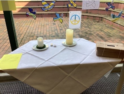 wir richten einen Gedenktisch für alle Opfer der Kämpfe in der Ukraine und der Pandemie in der Pausenhalle ein.