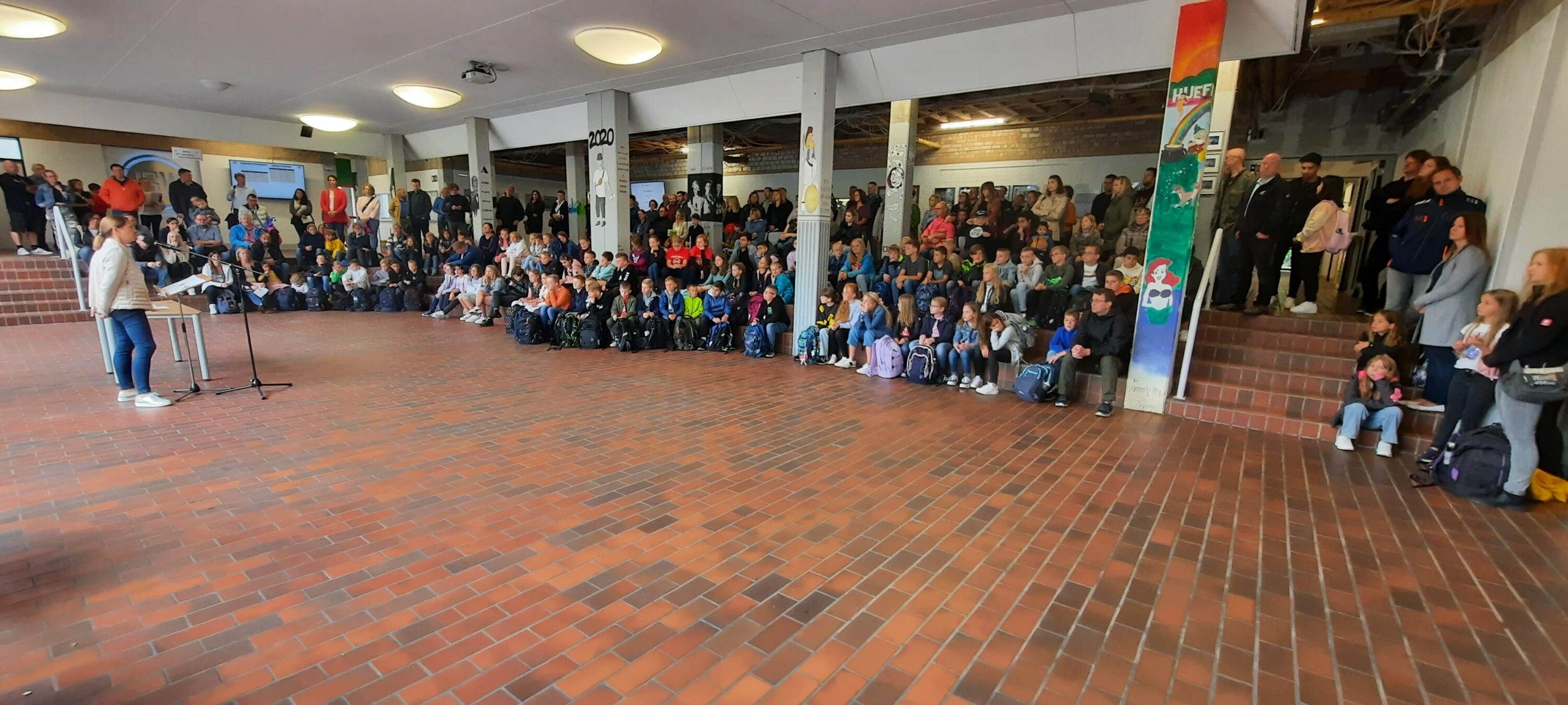 Der erste Schultag am Gymnasium ist ein besonderer Moment, der von Vorfreude und vielleicht auch ein wenig Nervosität begleitet wird. Die Schülerinnen und Schüler verlassen die vertraute Umgebung der Grundschule und treten in eine Welt ein, die neue Möglichkeiten, Herausforderungen und Freundschaften bieten wird. In ihrer Begrüßung zog Frau Krekeler einen Vergleich zwischen der Grundschule und dem Gymnasium. Sie verwies auf die Chance, das Wissen über die Welt zu vertiefen und ein breites Verständnis für verschiedene Themen zu entwickeln, denn am Hüffertgymnasium kann sich nicht jeder nur akademisch weiterentwickeln, sondern auch persönlich.