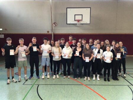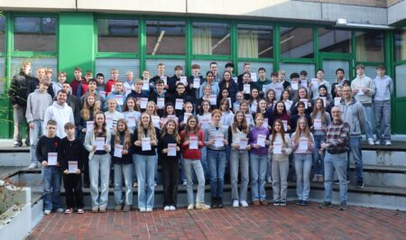 Das Hüffertgymnasium kann erneut auf einen bemerkenswerten sportlichen Erfolg blicken: Bei der diesjährigen Verleihung des Sportabzeichens für das Jahr 2025 legten die Schülerinnen und Schüler insgesamt über 100 Sportabzeichen ab. Allein in den Jahrgangsstufen 7 und 8, bei denen jährlich der Tag des Deutschen Sportabzeichens als Sportfest inszeniert wird, wurden 85 Abzeichen errungen, 23 davon in Gold. Hinzu kamen zahlreiche Sportabzeichen in der Oberstufe, die nicht nur eine Auszeichnung für sportliches Können waren, sondern auch für Bewerbungsunterlagen beim Übergang ins Berufsleben gebraucht werden.