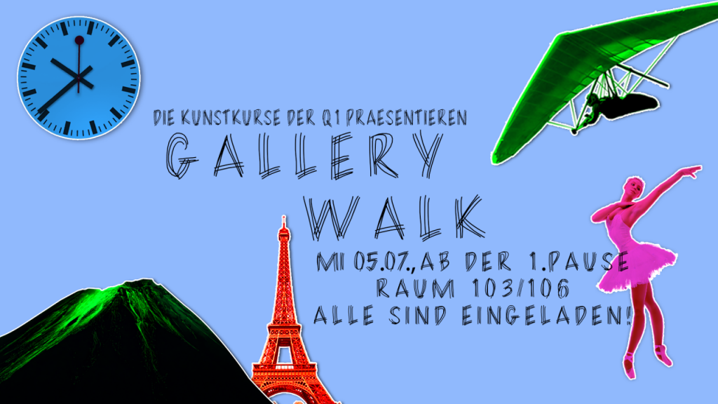 Wir, die Kunstkurse der Q1, haben in Kooperation einen Gallery Walk vorbereitet. Es werden einige der im Laufe des Jahres entstandenen Projekte ausgestellt. Wir freuen uns auf euch!